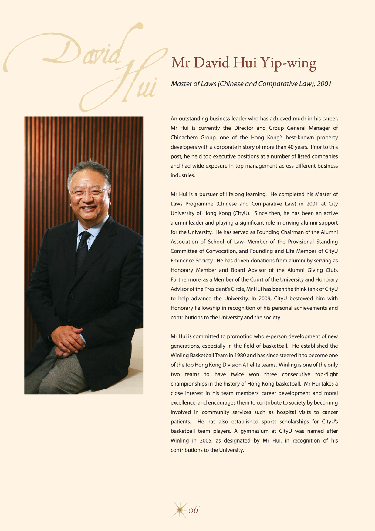 Dr Shi is the Chairman and Founder of Brilliant International Group Ltd. A renowned industrialist and entrepreneur, he has garnered a formidable reputation in the global printing and packaging industry. He actively contributes to the University development through the CityUHK Foundation, where he serves as member of the Foundation Board of Governors, the HK Tech 300 programme, and as Vice-Chairman of the CityUHK Eminence Society. He is CityUHK Court Member and was conferred the title of Honorary Fellow in 2021 by CityUHK. He is the former President of the Chinese Manufacturers’ Association of Hong Kong.