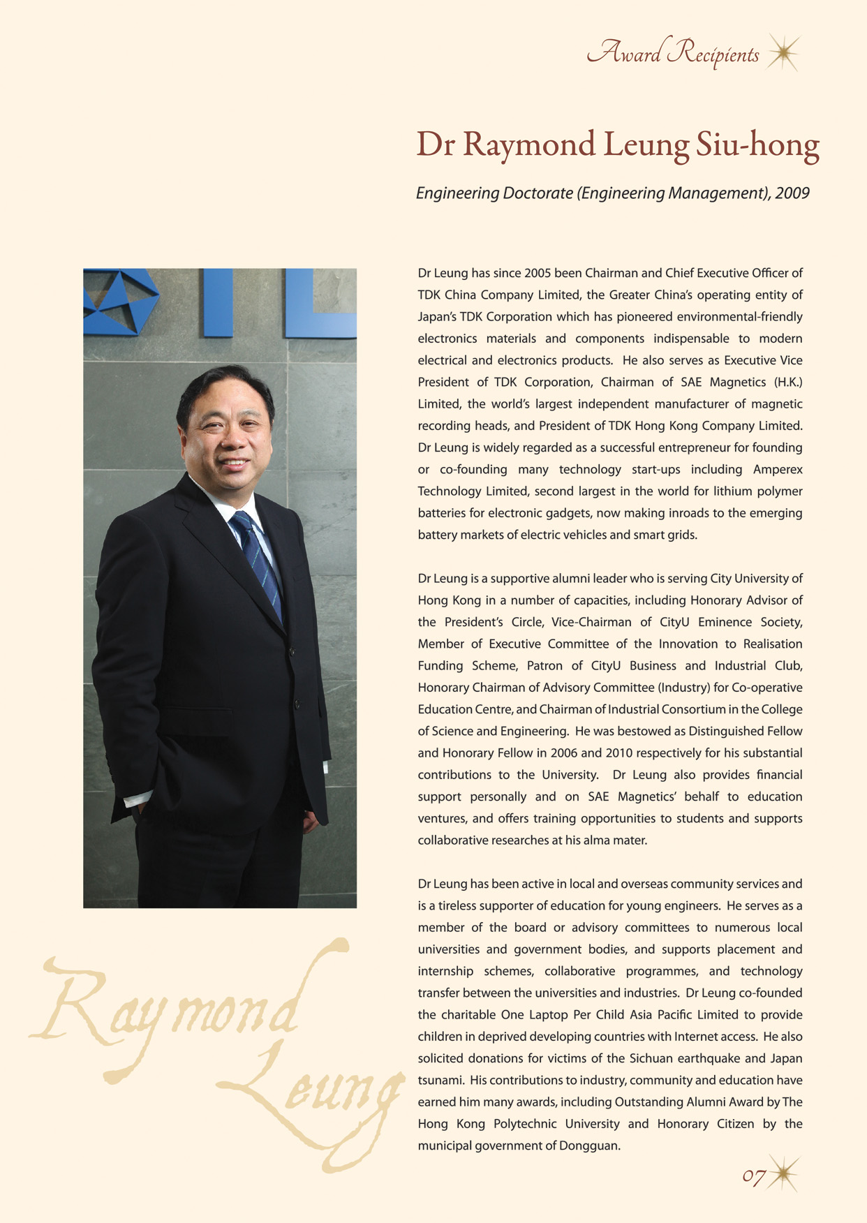 Mr Lam is the Group CEO and Vice-Chairman of Golden Resources Development International Ltd. Under his leadership, the company has become one of the top-selling rice providers in Hong Kong. He supports the University development through initiatives such as the CityUHK Foundation, the HK Tech 300 programme, the Industrial and Business Leaders Circle, and serves as Vice-Chairman of the CityUHK Eminence Society, and Chairman of the Departmental Advisory Committee of the Department of Marketing. He is also the Executive Deputy Chairman of the Federation of Hong Kong Industries.