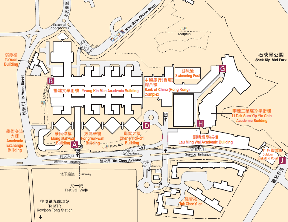 - Students can enter the campus via CityUHK entrance ("A"? in the below Campus Map) by presenting their HKID cards, and entrance QR code sent to their registered email accounts about 1 week before the assessment(s) :