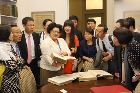![]() Miriam Childs (left), associate director of the Law Library of Louisiana, displays historical books for senior Chinese judges at the state Supreme Court. |
