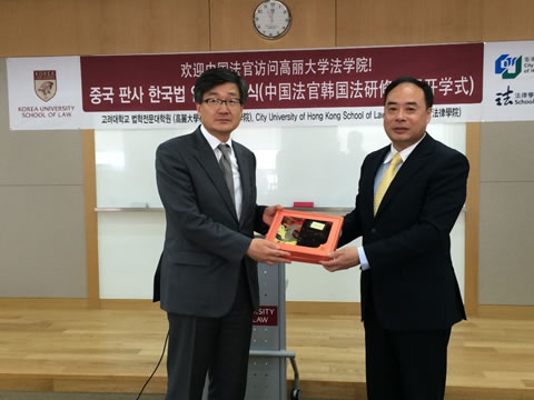 ![]() Professor Nohyoung Park (left), Korea University Law School accepts souvenir from Judge Xu Qingyu (right, JSD3 student, Director of Higher People's Court of Jiangsu Province) |