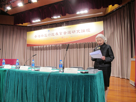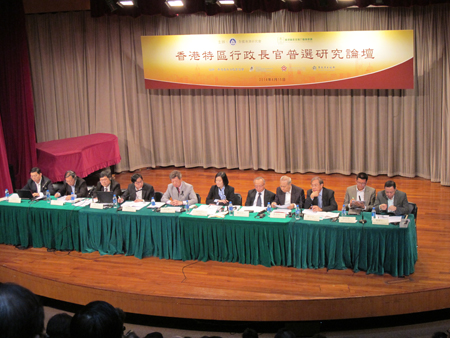 由全國港澳研究會及基本法推介聯席會議聯合主辦,并由香港城市大學司法教育研究中心、香港基本法教育協會、香港專業及資深行政人員協會、及香港學者協會聯合協辦之 「香港特區行政長官普選研究論壇」于2014年4月15日假城市大學惠卿劇院舉行。 |