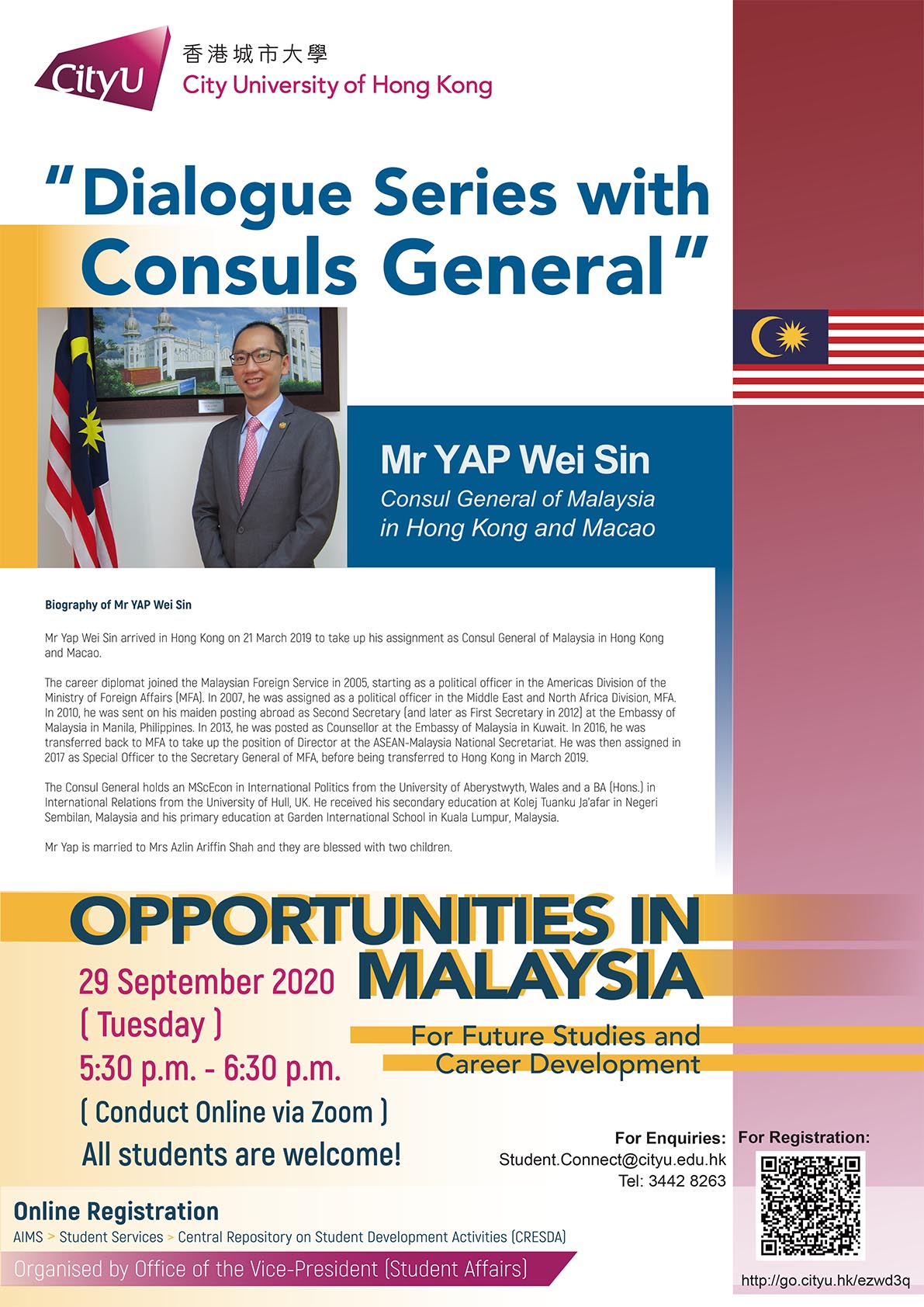馬來西亞駐港澳總領(lǐng)事葉威信先生訂於11月13日主講下一場「與領(lǐng)事對談系列」,介紹在馬來西亞的學(xué)習(xí)及職業(yè)發(fā)展前景。「與領(lǐng)事對談系列」邀請多國駐港領(lǐng)事及嘉賓蒞臨城大,與師生交流觀點,介紹該國最新發(fā)展及文化,並分享他們的深刻見解。欲知活動詳情,請按此處。