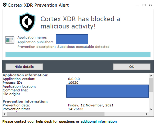 If you detect alert popup screens that look like the below screenshots, it means that the Cortex XDR agent has detected some malicious activities/files or it could be a false alarm. Please report to the IT Service Desk immediately and provide the screen capture of the alert popup screens for further investigation.