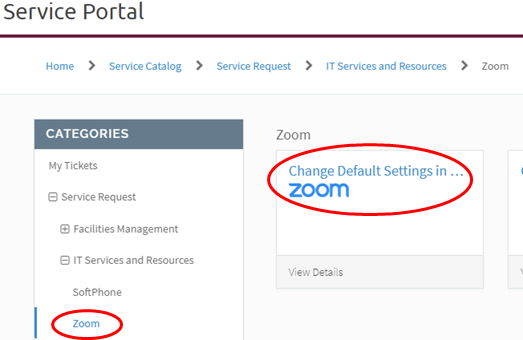 OR go to Service Request > IT Services and Resources > Zoom > Change Default Settings in Zoom.