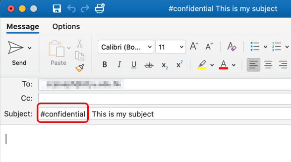 Type in the hashtag, "#cityuonly", "#staffonly", "#confidential", "restricted" or "highlyconfidential" in the subject field as prefix to apply the Sensitivity Label automatically
