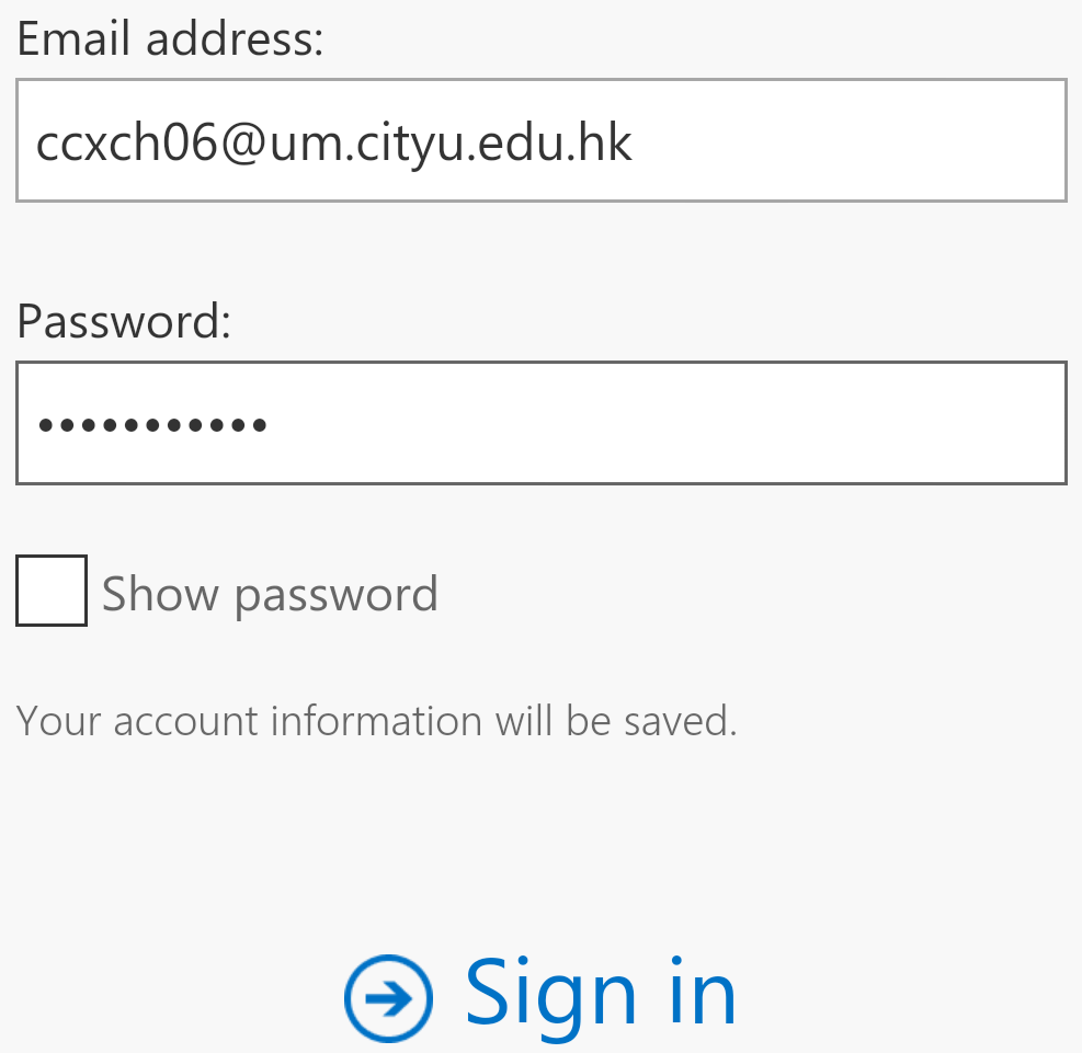 For the first time you run the mobile OWA app, it will display the Sign in view. Enter Email address in the format eid@um.cityu.edu.hk and Password, then tap Sign in.