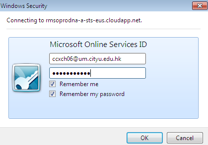 - Enter your email address in the format "eid@um.cityu.edu.hk" and password. Make sure the options Remember me and Remember my password are checked and click OK.