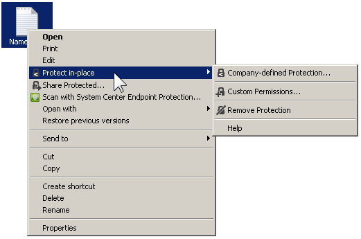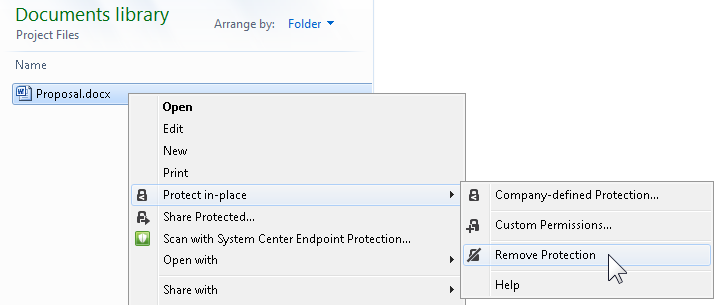 If you later want to remove the protection from a file, right-click the file, click Protect in-place, and then click Remove Protection (Note: You must be an owner of the file to remove the protection.).