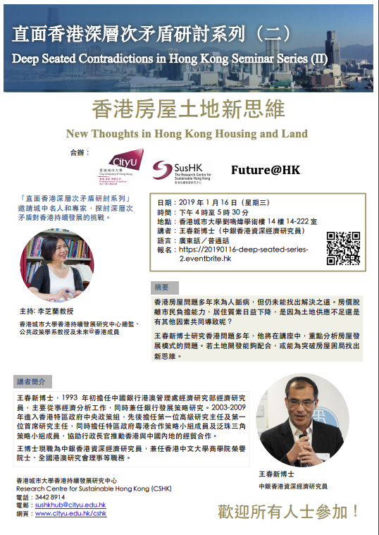 ?港房屋問題多年來為?詬病,但仍未能找出解決之道。房價脫 離市?負擔能?,居住質素?益下降,是因為?地供應不?還是 有其他因素共同導致呢? 王春新博?研究?港問題多年,他將在講座中,重點分析房屋發 展模式的問題。若?地開發能夠配合,或能為突破房屋困局找出 新思維。