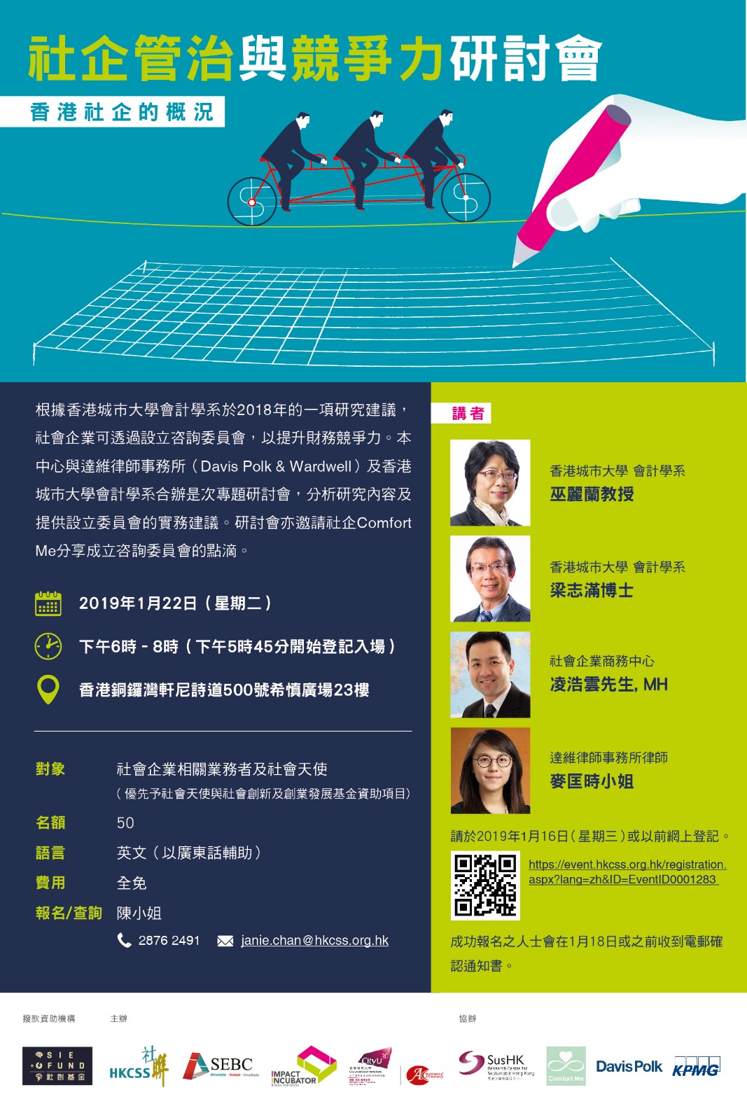 According to a research by the Department of Accountancy of City University of Hong Kong in Oct, 2018, Social Enterprise (SE) can improve financial competitiveness by setting up Advisory Committee. At the captioned seminar, SEBC invited the lead professors of the research and the solicitors of Davis Polk & Wardwell to present the research findings and to share some practical advice on drafting the terms of reference of the committee respectively. There will be a case sharing by Comfort Me, a SE has set up their advisory committee recently.