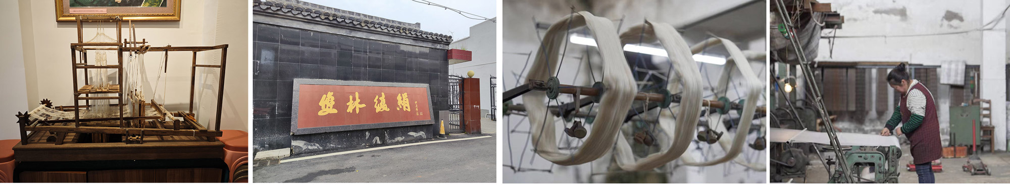 左一:木製紡織機模型廠;左二: 設於浙江湖州雙林鎮的綾絹厰; 右一及右二:內現設機器生産綾絹