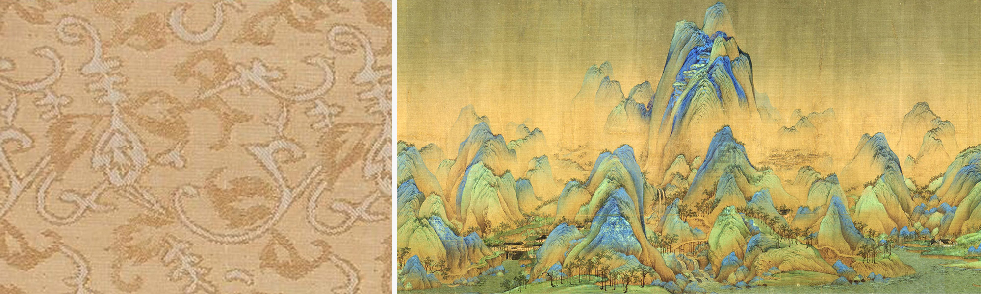右:北宋王希孟的《千里江山圖》,描繪了峰巒起伏綿延,山間曲徑,房舍屋宇點綴其間,綠柳紅花,長松修竹,景色秀麗。其絢爛的色彩和細緻的筆法,一向被視為絹本青綠山水的代表作。