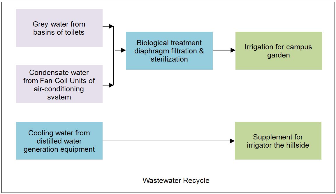 This System is for collection, filtration and disinfection of wastewater from wash basins, condensate water from air-handling and fan coil units in offices, and discharged water from equipment cooling in laboratories for irrigation.