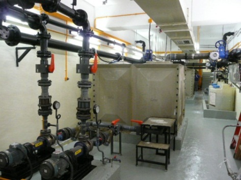 All the sinks and floor drains in the lab areas on Floors 1, 2 and 4 of Yeung Kin Man Academic Building are connected by piping down to the Neutralization Plant, which is installed on the basement of the same building. The liquid waste is piped into one of the two fibre glass storage tanks (12m3 litres capacity each) alternatively. A water level controller inside each of the tanks controls the inlet motorized valve's open and close action, which in turn controls the liquid waste feeding into the tank. At any one time, only one tank will accept liquid waste. When a tank is filled up, its' inlet motorized valve will be closed and its' pH control stage will start. Meanwhile, the inlet motorized valve of the other tank will be open to accept wastewater.Depending on the pH level of the wastewater, either sulphuric acid or sodium hydroxide will be dosed into the fibre glass storage tank by chemical dosing pumps, until the pH value reached the pre-set value of the 6.2~7.9 on the pH controller. The dosing of the chemicals is entirely automatic and controlled by a micro-processor controller. An agitator installed inside the tank is used for mixing the wastewater with the dosing chemicals. The chemical dosing system includes the pH level sensors installed inside the storage tanks, pH controller in the control panel, chemical dosing pumps, chemical storage tanks and feed pipes. All these are housed inside the neutralization plant room. After the pH value is settled steadily at the pre-set value of 6.2~7.9, the neutralized wastewater will be discharged into the sewer by effluent pumps. A sump pit with two submersible pumps has been provided inside the plant room to collect any water and/or chemicals overflow from the storage tanks, cleaning of floor and equipment; etc. The wastewater so collected will be fed into the storage tanks for neutralization before discharging to public sewer. In cases when the Neutralization Plant is broken down due to either equipment failure, lack of dosing chemicals for neutralization purposes, piping leakage, etc., discharge of any wastewater into the system at very short notice. |