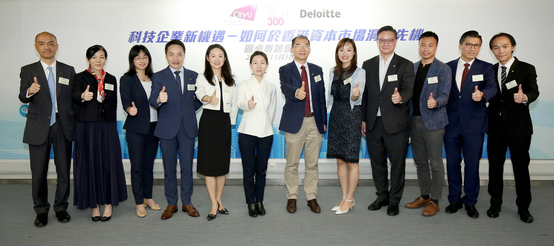 (from left) Mr Paul Chau, Head of Investment Banking & Global Capital Markets, Ping An of China Capital (Hong Kong) Co. Limited; Ms Iris Leung, Partner, Hong Kong Office of K&L Gates; Ms Winnie Han, Head of China Issuer Services and Senior Vice President of Global Issuer Services of HKEX; Mr Edward Au, Southern China Region Managing Partner of Deloitte China; Ms Yang Mengyang, Executive Director and Head of Hong Kong PE Business, CICC Capital Management Department, CICC; Dr Hon Wendy Hong Wen, Legislative Council Member (Election Committee); Professor Michael Yang, Vice-President (Research & Technology), CityU; Ms Lillian Cheong Man-lei, Under Secretary for Innovation, Technology and Industry; Mr Raymond Wong, Head of Investment, Hong Kong Science and Technology Parks Corporation (HKSTP); Mr Lap Man, Founding Partner, Beyond Ventures; Hon Duncan Chiu, Legislative Council Member (Technology and Innovation); and Mr Robert Lui, Southern Region and Hong Kong Offering Services Leader of Capital Market Services Group, Deloitte China.