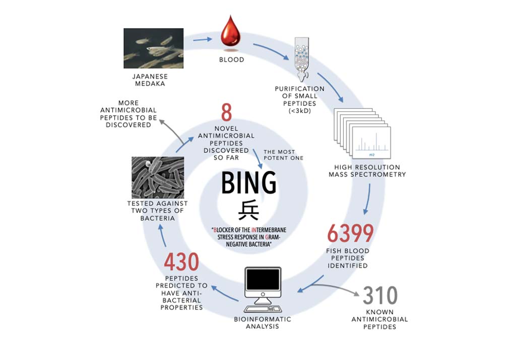 The emergence of antimicrobial resistance (AMR) in microorganisms is a major global threat to human health. To address this issue, our team established a fish serum peptide database. One of the peptides, namely BING, has excellent antimicrobial properties. It can kill drug-resistant bacteria and suppress their capability to develop further antibiotic resistance. In addition, BING can enhance the power of other antibiotics. It has low toxicity for mammalian cells and is thermally stable. Our next steps will be compound optimisation and animal experiments. The ultimate goal of this project is to develop BING into a life-saving therapeutic drug.