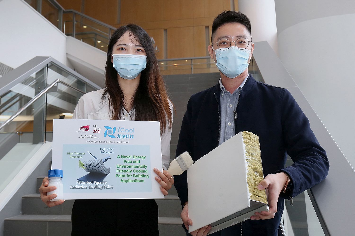 To provide significant benefits to society, outstanding research achievements need to be transformed into practical applications. Research assistant Shirley Du and PhD student Martin Zhu, from the School of Energy and Environment (SEE) of CityU, and other team members decided to turn the scientific research findings of their supervisor, Dr Edwin Tso Chi-yan, an assistant professor in the SEE, into a product that would have a significant impact on society and the environment. They set up a start-up company called “i2Cool” to develop and promote zero-energy, low-cost, highly-efficient passive radiative cooling paint to save energy and reduce carbon emissions in cooling buildings.