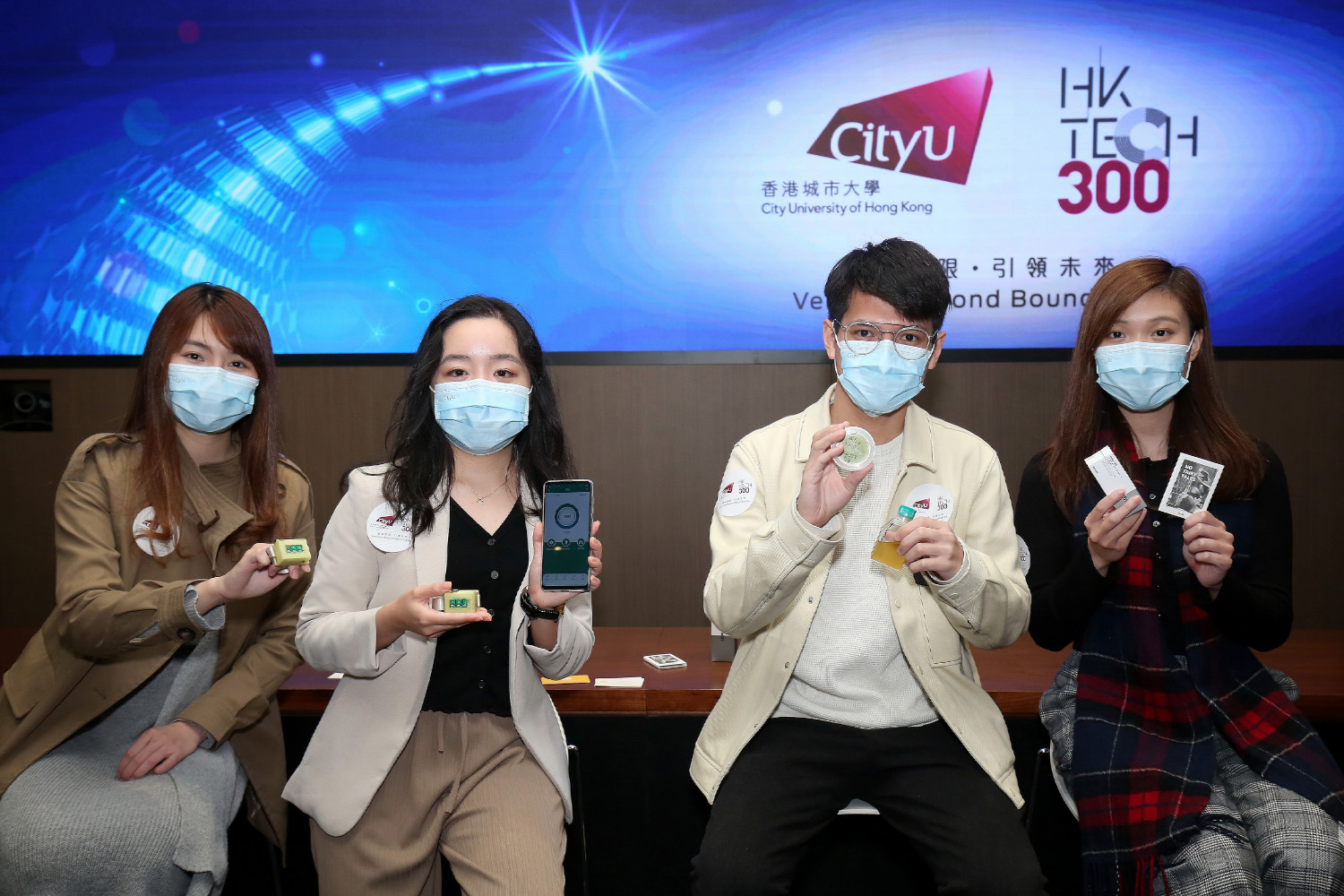 出身於城大的謝文蔚與顏煒彤(左一及二)創(chuàng)立里索科技,研發(fā)輕度和中度聽(tīng)障人士適用的手環(huán);而蘇樂(lè)文及謝敏鈴(右二及一),創(chuàng)立聯(lián)手生命科技有限公司,設(shè)立以科學(xué)實(shí)證為基礎(chǔ)的香港護(hù)膚品牌。