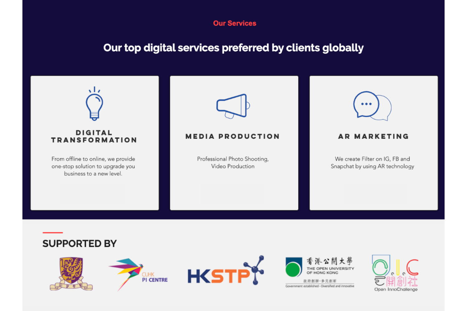 Madzone是集數(shù)碼營銷、多媒體制作和擴(kuò)充實(shí)境(AR)技術(shù)的公司。Madzone創(chuàng)立于香港中文大學(xué)的PI Centre,并成長于香港科學(xué)園STEP計(jì)劃,主力為企業(yè)提供數(shù)碼轉(zhuǎn)型和營銷服務(wù),透過網(wǎng)上廣告、內(nèi)容營銷和社交媒體管理,為客戶建立品牌和帶來銷售增長。