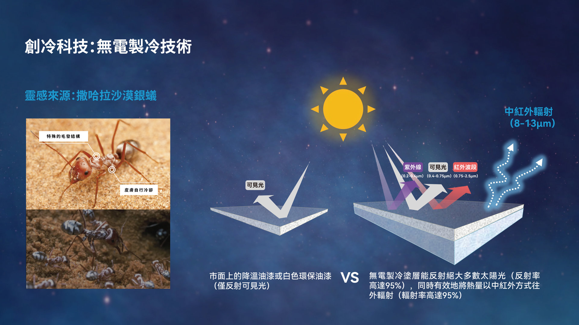 i2Cool的「iPaint無電製冷塗層」,是一款零耗能、無需製冷劑的被動式輻射製冷塗層,由城大能源及環(huán)境學院曹之胤副教授自2016年起帶領研發(fā)。項目的研發(fā)靈感來自撒哈拉沙漠的“銀蟻”,其表面特殊的毛發(fā)結構,擁有反射陽光和被動式輻射散熱的機制,能夠抵抗攝氏70度以上的高溫和曝曬環(huán)境,這項技術至今已獲得多個國際專利。
