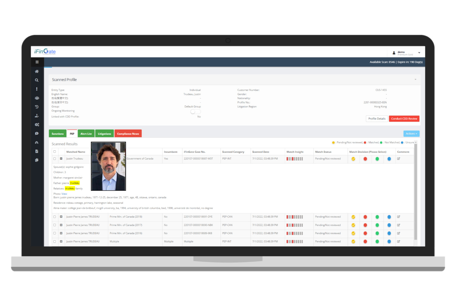 使用iFinGate的用戶能在幾秒間內完成對制裁、訴訟及可疑名單、識別政治人物 (Politically Exposed Persons,簡稱PEPs)和合規新聞的篩選。我們的系統亦協助持牌企業應對監管環境轉變的挑戰,並致力於普及程序自動化及科技的應用,令合規流程不再昂貴和耗時。