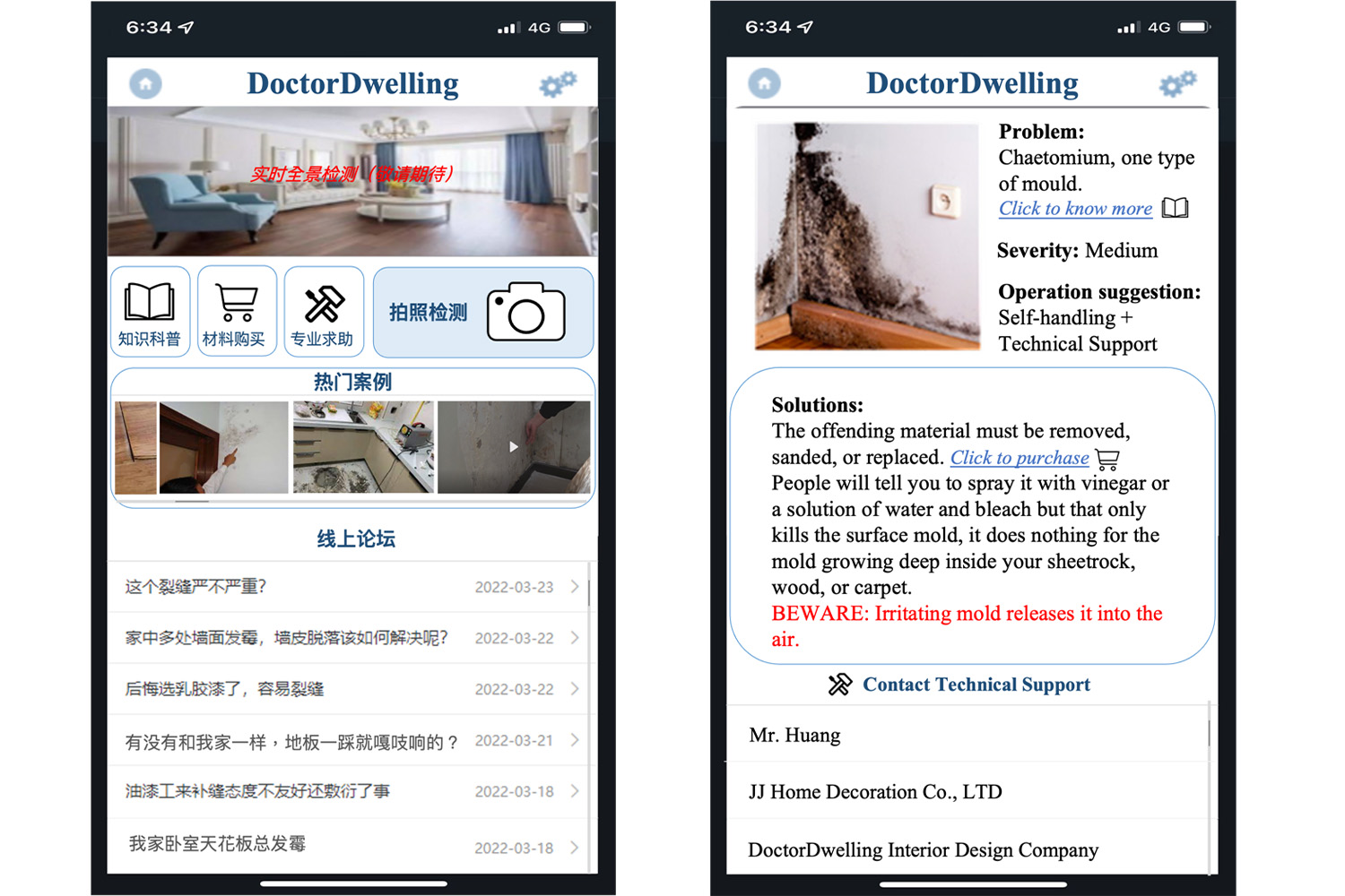 我們的團隊開發(fā)智能應用程式DoctorDwelling,協(xié)助居民初步診斷樓宇室內(nèi)問題。用戶只需拍攝照片,就能識別問題,得到分析和措施建議。具體來說,DoctorDwelling應用深度學習方法,透過照片自動識別問題,並按照1) 緊急排序; 2) 知識普及和維修建議; 3) 操作及購買物料指導(如問題可由居民自行處理); 以及4) 聯(lián)絡技術支援,給予用戶意見。