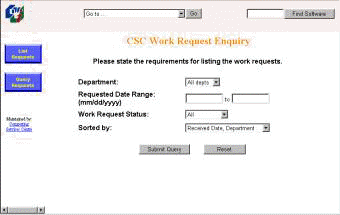 The Computing Services Centre (CSC) receives lots of job requests from departments/offices every day. These requests are handled on a first-come-first-served basis. In order to allow colleagues to check the status of their work requests, a Web-based enquiry system has been developed. This easy-to-use enquiry system provides detailed information on all requests on-line. With this system, you can selectively look at the requests by various means, such as request number, department, and requested date range. Moreover, you can arrange the selected requests in different orders for ease of viewing.