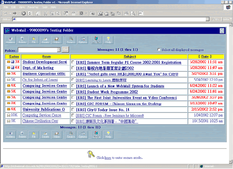 Since 1999, the Computing Services Centre (CSC) has provided a WebMail service using the Mailspinner software. Since the vendor of Mailspinner was acquired, support quality has dropped significantly. Unresolved technical problems such as language support remain unresolved. For continuous improvement of service quality, the CSC is regularly reviewing this service and searching for better solutions. After a period of vigorous software evaluation, in-house tailoring and pilot run, we are pleased to announce that a brand new WebMail system powered by Infinite InterChange 3.62 was launched for students and alumni in May 2002.