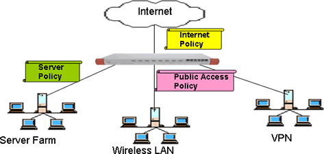 Our IPS is a high port density device. There is a total of 20 gigabit ports and it allows 9 independent network segments to be connected to it. Our IPS acts as multiple virtual IPSes which protects multiple LAN segments concurrently. The following figure shows the possible deployment of the IPS.