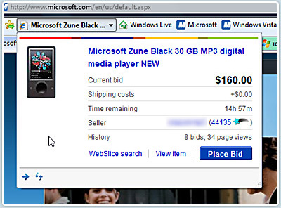 Web Slices allow you to keep up with frequently updated sites directly from the new Favorites Bar. For example, if you want to watch eBay bidding price you can get information from the Web Slice without having to visit the eBay website.
