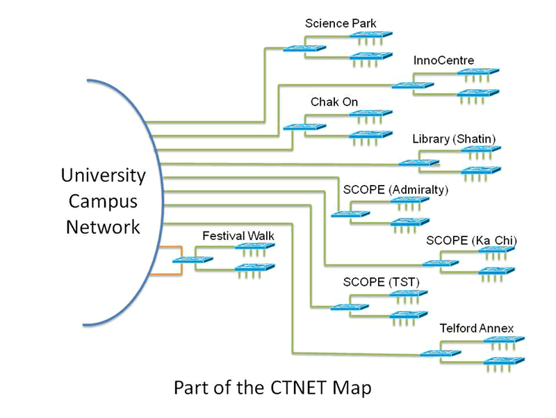 More often than not, the Computing Services Centre (CSC) needs to rely on the Internet Service Provider (ISP) to provide the WAN links from the remote offices to the CityU’s main campus and the rental cost in general is proportional to the bandwidth subscribed. However, in the case of Festival Walk, the CSC had laid its own optical fibre cable between the CSC’s Computer Room and Festival Walk offices, consequently, the CSC was able to offer a higher bandwidth for Festival Walk than other remote offices without paying ISP any rental cost.
