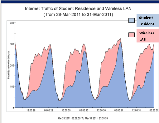1. Student Residence consumes 31.3% of the total consumed Internet Traffic of CityU 2. The Internet Traffic of Student Residence (31.3%) is nearly equal to the Internet Traffic consumed by all other user departments (36.9%) 3. Student Residence plus Wireless LAN consume about 45% of the total consumed Internet Traffic of CityU Bandwidth usage of wireless LAN and student residence 1. The wireless LAN traffic is increasing rapidly during day time from 9:00am to 18:00 2. During day time, the wireless LAN Internet traffic is greater than that of student residence which is consuming at a low rate, less than 100M bps 4. As a result, the Internet traffic of wireless LAN and Student Residence is complementing each other. The student residence consumes the released bandwidth from the wireless LAN after office hour. Thus, it reduces the total Internet usage of CityU 5. The sum of peak network traffic of wireless LAN and Student Residence is about 300 Mbps |