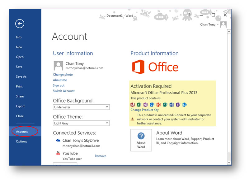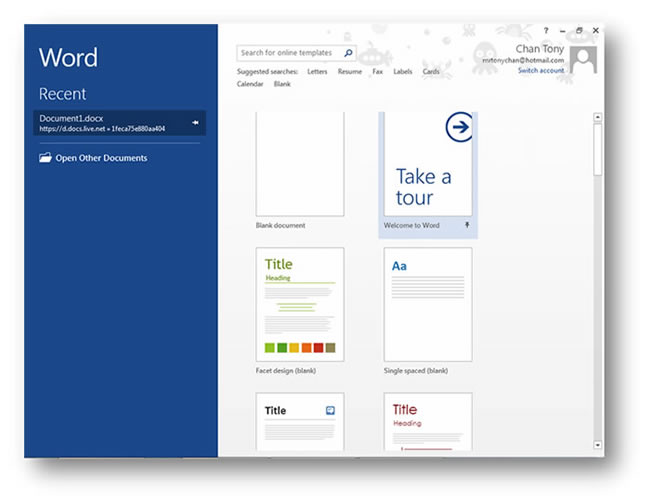 Office 2013 conforms to the flatness design of Microsoft Modern UI. White backgrounds are used in Office applications. Much of the visual effects like translucent Aero UI, 3D elements and shadows have been removed. Blank pages won’t be shown at launch of applications. Instead, a new colour-coded start screen (blue for Word, green for Excel, orange for PowerPoint) will be displayed, presenting templates, a list of recent documents, and an option for reopening a document, as well as showing details of the SkyDrive account that you are currently logged in.![]()
