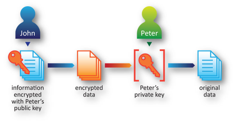 Public Key encryption uses a key pair to protect and access sensitive information. The key pair consists of a public key and a private key. Suppose John wants to share sensitive information with Peter securely. John will use Peter’s public key to protect (encrypt) the information and share the encrypted information with Peter. When Peter receives the encrypted information, Peter has to use his own private key to decrypt it, otherwise, he will not be able to read the information.