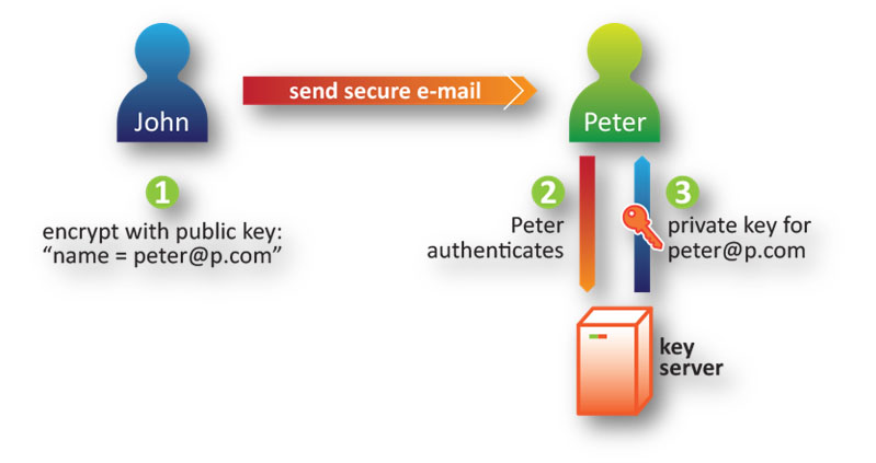 IBE, as compared with PKI, eliminates the need of a complicated structure for certificate management. Instead, a Key Server is introduced here. The sender, John, uses the email address of the recipient, Peter, to generate Peter’s public key for encrypting the information he wants to share with Peter. When Peter receive the encrypted information, Peter authenticates to the Key Server, automatically and transparently obtains his private key to decrypt the information. This mechanism equally protects sensitive information but is both simple and easy to use.