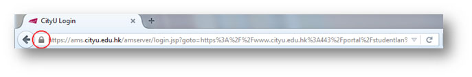 If the URL begins with “https://”, you will see a lock icon in the address bar of your web browser (see pictures below), meaning that the connection to the website is secured. However, if a red/orange strip or an exclamation mark is shown on the lock icon, it means that the connection is unsafe, e.g., the secure certification (SSL Certificate) is invalid, has expired, etc. Please do not provide your username/password to such websites.