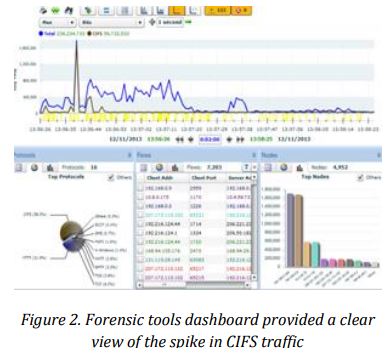 UTM-AIS run case study at their Cyber Forensic Lab in Malaysia to simulate cyber incident and study the effectiveness of their cyber incident response procedure on the campus, During the simulation process, the network based IDS on an enterprise network raised an alert about unusual activity on a server. (In the screenshots below, the compromised node is identified as the address 10.4.3.248). When a team of forensics analyst was conducting an investigation, they discovered that the server was compromised by a security attack. Unfortunately, the IDS logs provided no further information about the attack, as the list of other compromised systems or attacker’s details. With the aid of forensic tools – dashboard (in this case, WildPackets Compass), forensics experts were able to identify compromised system. In fact, the Common Internet File System (CIFS) traffic spiked shortly after the attack had begun. The screenshot on the left shows an example of such a CIFS spike.