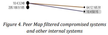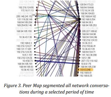 One of the advantages about network forensic appliance in this scenario is that it recorded all network traffic around the time of spike; this gave the forensics experts an upper hand to examine network activity in depth and explore this burst of traffic and its consequences. To present the discovery process more accurately, the forensic analyst would start a Peer Map which showed all IP communications during the spike period. As suspected, the Peer Map revealed how the compromised server had communicated with several other internal systems.