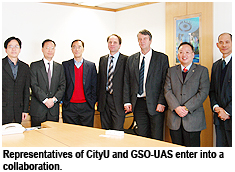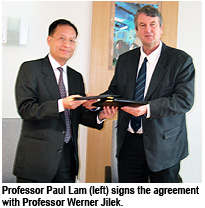 Professor Paul Lam, Director of CityU’s Co-operative Education Centre, signed a memorandum of understanding with Professor Werner Jilek of GSO-UAS on 10 January. Both universities will exchange two to three students for industrial placement this year. German students will undergo industrial training in Hong Kong and the Pearl River Delta for a period of about five months, according to the requirements of the UAS; CityU students will undergo industrial training for two to three months in Germany, in accordance with normal IAS arrangements.
