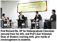 After the prize presentation, Professor Richard Ho, Vice-President for Undergraduate Education, and Professor Lilian Vrijmoed, Dean of Student Learning, spoke to the students. They and two students then discussed topics on stage such as learning experience, the importance of undergraduate education, life goals and time management. The two student representatives are Mr Dennis Cai, one of the winners, and Mr James Chen, a Year 3 student from the Department of Electronic Engineering.