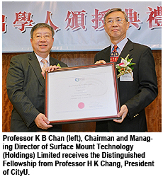 The Distinguished Fellow Scheme was set up to confer the title of "Distinguished Fellow" on outstanding industrialists, professionals and entrepreneurs, based on the recommendations of faculties and departments at CityU. The five-year appointment may be renewed, subject to the recommendation of related faculties and departments. The Faculty of Science and Engineering (FSE) recommended the conferment of Professor Chan and Mr Leung, and the Senate of the University approved the recommendations.