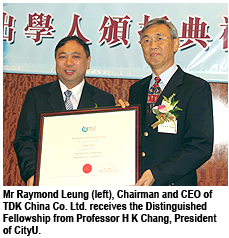 "As outstanding industrialists, Professor Chan and Mr Leung have the same mission as CityU, which is to promote connections between CityU and industry in order to nurture industrialists for the next generation. They both fully support the Industrial Attachment Scheme and Co-operative Education Scheme (CES) in FSE, initiatives that have already benefited over 1,500 students," Professor Chang said.