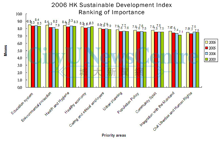 The Department of Management Sciences at CityU, which has been compiling the Index since 2003, interviewed 2,054 people aged 18 or above in August 2006. They were asked to rate the level of importance to sustainable development of 10 priority areas, and their level of satisfaction with performance in these areas, on an ascending scale from 1 to 10.