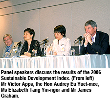 The announcement of the results was followed by a panel discussion on what needs to be done to further the sustainable development of Hong Kong. Speakers included the Hon Audrey Eu Yuet-mee, Leader of the Civic Party; Mr Victor Apps, Vice-Chair of the Hong Kong Employers Federation; Mr James Graham, Chair of Business Coalition on the Environment; and Ms Elizabeth Tang Yin-ngor, Chief Executive of Hong Kong Confederation of Trade Unions. Ms Christine Loh Kung-wai, CEO of Civic Exchange, gave the closing remarks.