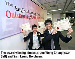 Joe Wong Chung-kwan, a final-year student in the Department of Public and Social Administration, won the Outstanding Student Award in both written and spoken language courses. She appreciated the relaxing learning atmosphere ELC created, which allowed her to enjoy learning English. “ELC provides many resources for independent learning. I could easily locate the resources addressing my own learning interests and needs,” Joe said. “The teachers there, instead of pointing out the mistakes we made just as the secondary school teachers did, encouraged us to participate in and learn from the activities. I think this boosted our motivation to learn.” Sam Leung Ho-chuen, a Year 2 student in the Department of Biology and Chemistry, won the award in the written language course. He believed the ELC courses were good for students to keep improving their English. “We had English lessons almost every day at secondary school. I think the ELC courses are useful because mastering English is also important to science students,” he said. To help students master their English language skills - essential to success in a globalised world - CityU has implemented a series of courses and learning activities. Besides the courses offered by ELC, the University has also taken other initiatives, including the Language Companion Course, English Language Clinic and English immersion programme, to create an environment that motivates students to improve their English. |