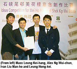 The competition was divided into professional and open groups, with the latter open to the general public. The CityU team formed by Alex Ng Wui-chun and Leung Hong-kei, both final-year students in the Department of Building and Construction, and Ivan Liu Man-ho and Maxx Leung Kei-hang, graduates in the same department and the Division of Building Science and Technology respectively, was selected as one of the three winners among the 33 teams in the Open Group.
