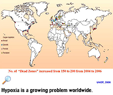 Hypoxia is a growing problem worldwide mostly caused by pollution, such as excessive input of nutrients, agricultural wastes and domestic waste water, into the seas.