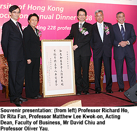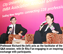 Dr Fan at the annual dinner. Mr Chiu took the opportunity to point out that the Faculty of Business at CityU recently became the first business school in Greater China to receive accreditation from three prestigious organisations, namely AACSB, EQUIS and the Association of MBAs.