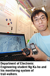 Sadly, an off-duty police officer is still missing after going hiking among the many trails of Hong Kong. This unsolved case inspired Ng Ka-ho, a Department of Electronic Engineering student and keen hiker, to develop a monitoring system that utilised the Global Positioning System (GPS). With a Bluetooth GPS receiver, a mobile phone supporting the Java application and software designed by Ng Ka-ho, hikers can identify their exact location on a mobile phone screen. They can also preset a time to automatically send an SMS to a designated emergency contact, indicating their location should an accident prevent the user from moving for a certain period of time.